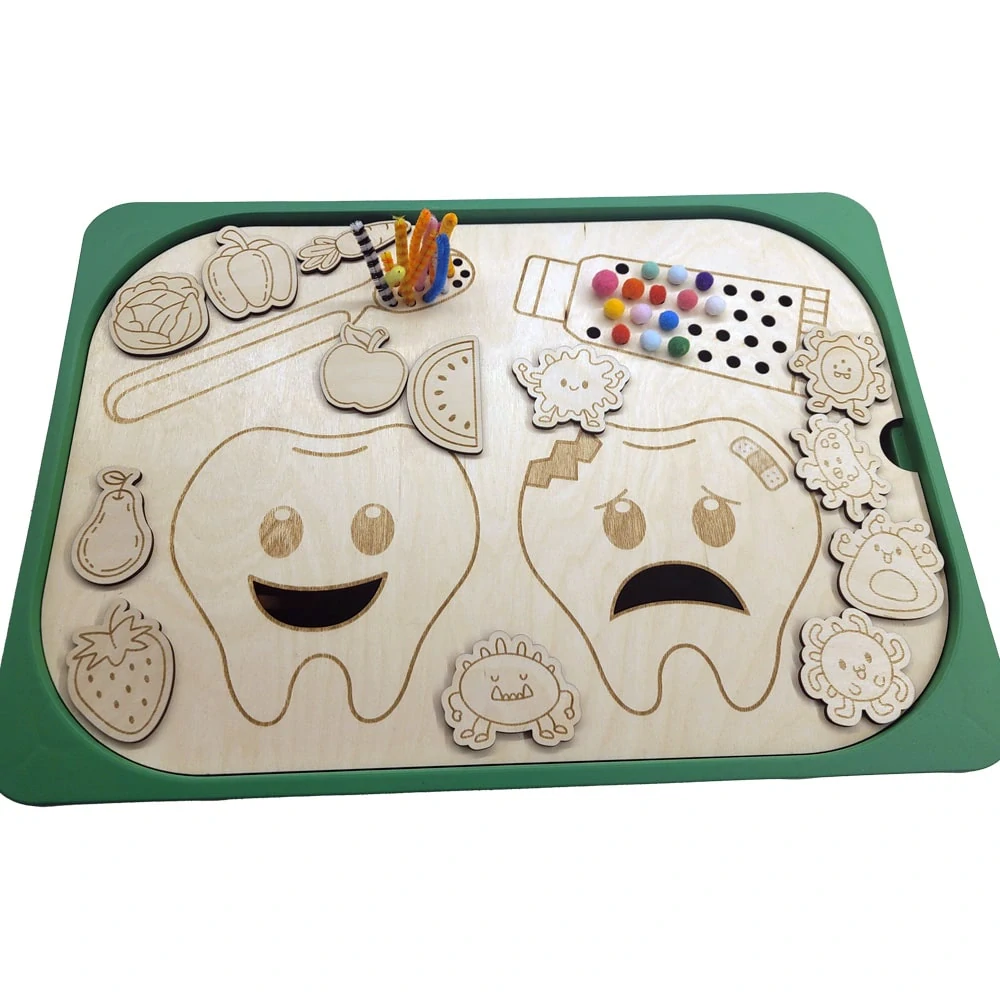 Hravá a edukativní dřevěná deska, která pomáhá dětem pochopit, proč je důležité starat se o své zoubky! Na desce najdete dva vyřezané zuby – jeden zdravý a druhý s kazem. Každý má otevřenou pusinku, kam děti mohou vkládat gravírované dřevěné dílky – zdravé potraviny, jako je ovoce a zelenina, nebo škodlivé bakterie, které způsobují kazy. Dále si děti na desce pomocí chlupatých drátků mohou vytvořit kartáček a nebo jen tak pokládat bambulky na vyřezané dírky v pastě.