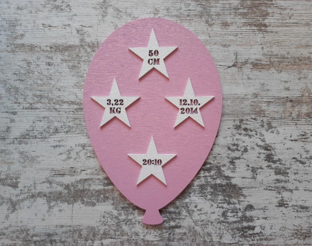Dřevěná jmenovka balonek + 4 porodní údaje .