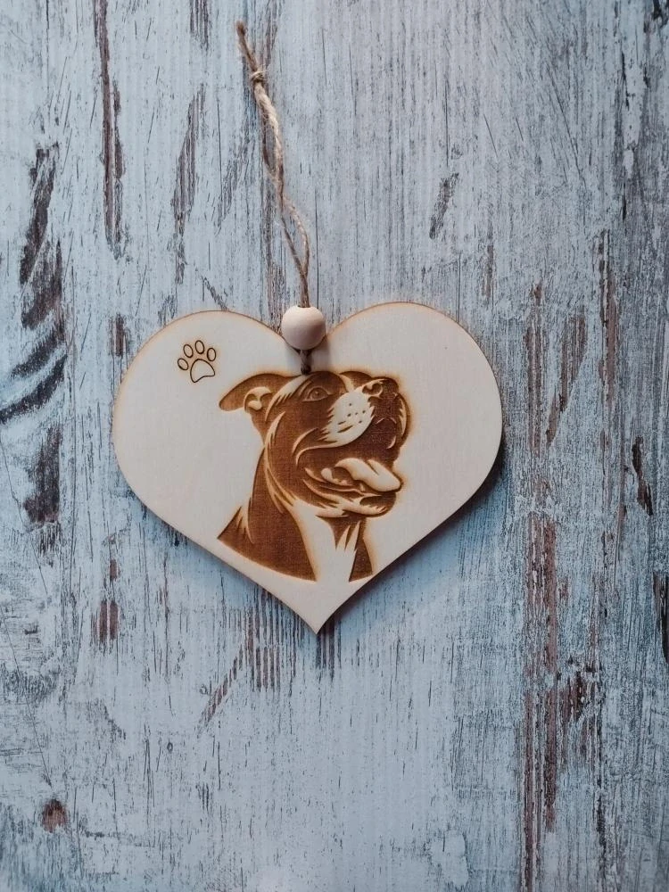 Dřevěné závěsné srdíčko s motivem psa - Anglický stafordšírský bulteriér.