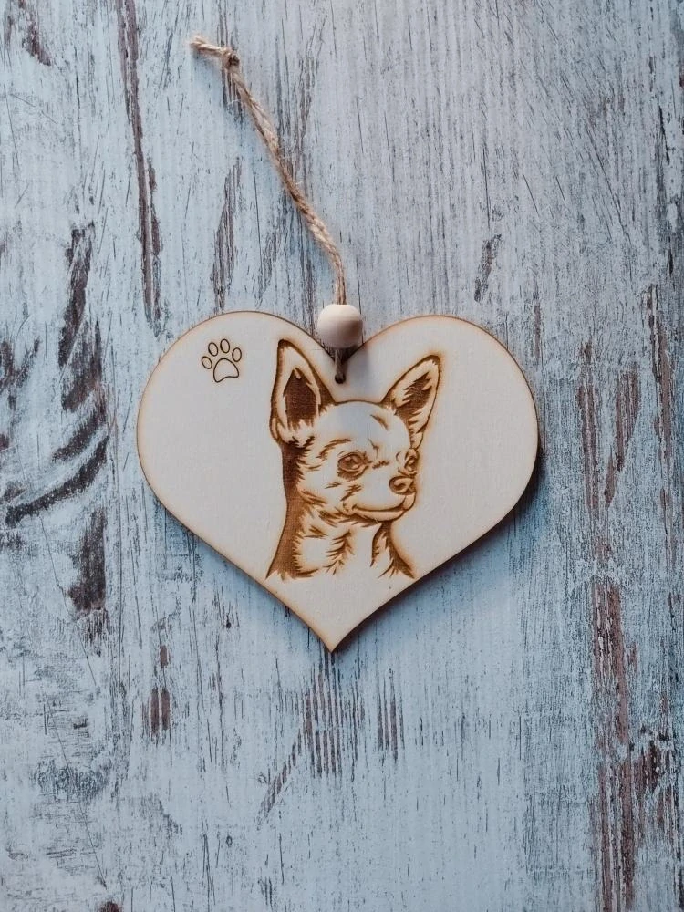 Dřevěné závěsné srdíčko s motivem psa - Čivava krátkosrstá.